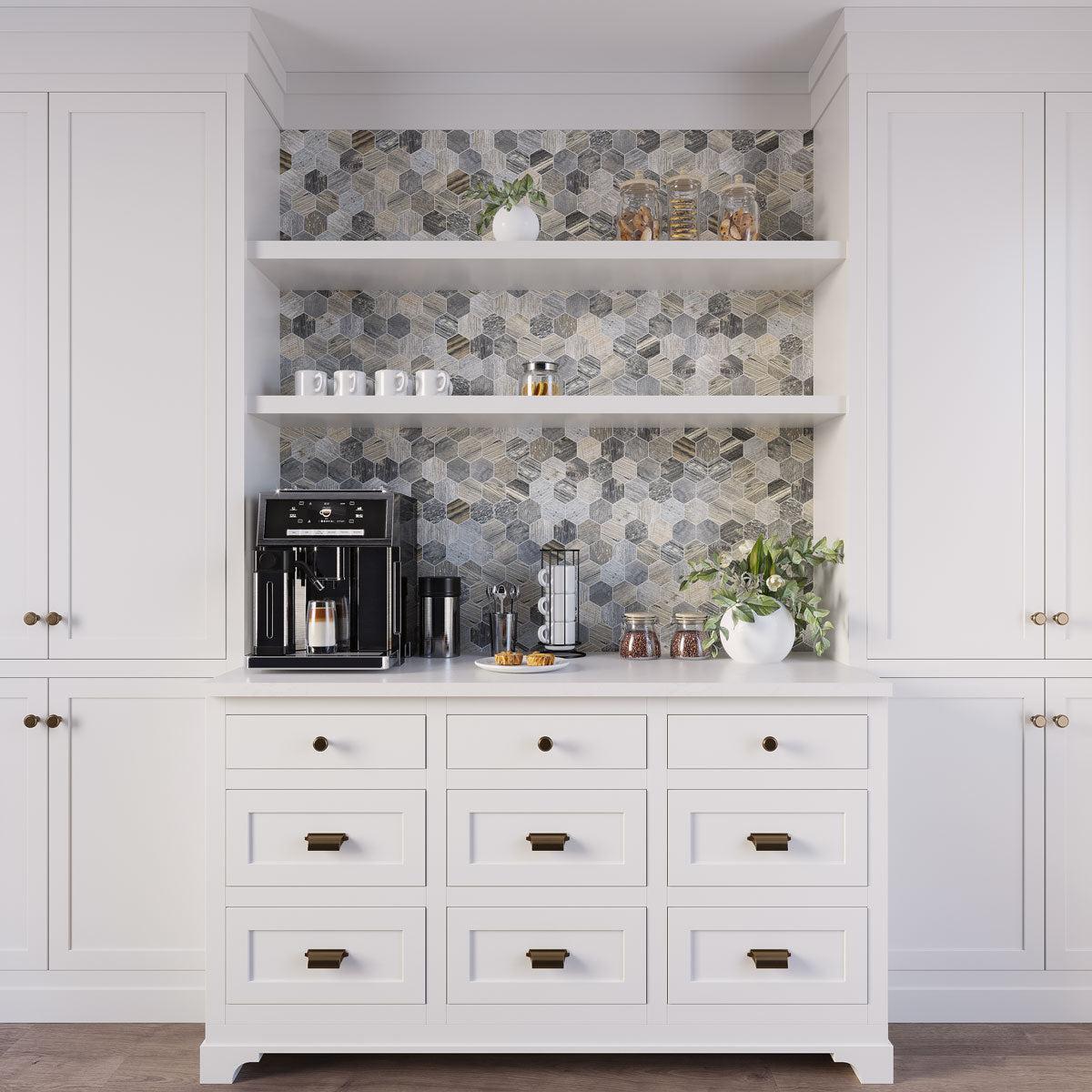 The trend applies to all areas of the kitchen, even the coffee bar. Pairing a statement backsplash tile, like our Gems Hex Agata Wood Look Glass Tile, with various styles of hardware on the drawers and some floating shelves is a great way to achieve this look.