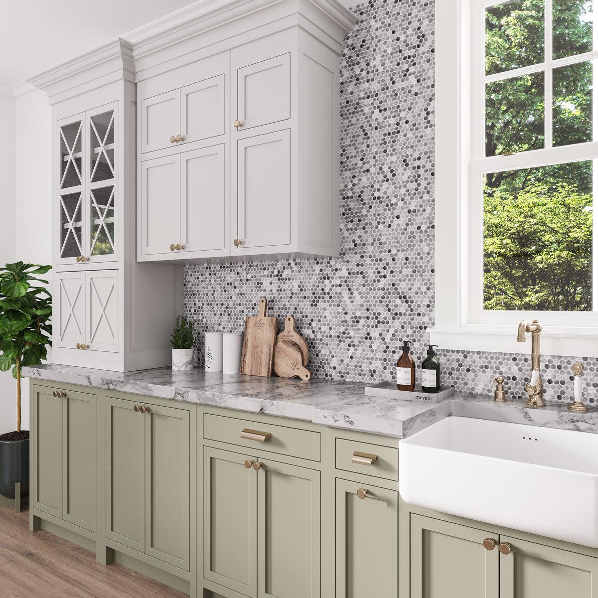 Want to be timeless yet trendy? Then allow this kitchen to inspire you! Using the Bardiglio Penny Rounds Marble Polished Mosaic Tile on the backsplash, it’s giving off luxury vibes. As for the kitchen cabinetry; it is totally on trend with its light green color pop.. To complete this look, choose white appliances to give your space a clean and bright feel or mimic the home above and go for a marble countertop.