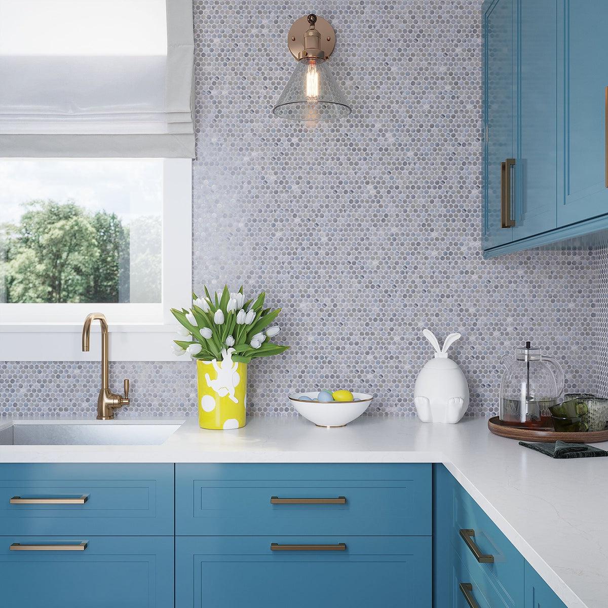 Seasonality really shines in this kitchen! A little easter bunny, some bright eggs, tulips, and of course some bright blue cabinets to top it off! We love how the Mixed Gray Glass Penny Round Mosaic Tiles are styled in this spot. The subtle gray glass tiles against the vibrant blue cabinets create an eye-catching contrast that instantly brings color and personality into the room.