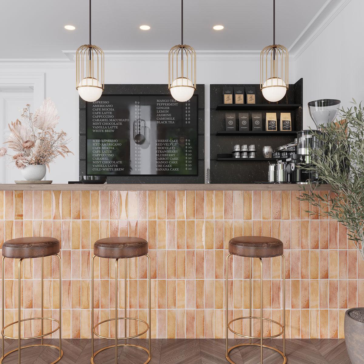 Don’t forget that if you’re placing your mixed-up tiles in a commercial setting you should always consult the way the design works as a whole. Take for example, how seamlessly the Luna Arc Pink Subway Tile pairs with the smooth Pink Subway Tile on this bar’s facade and integrates in a natural way to the bar stools as well as lighting.