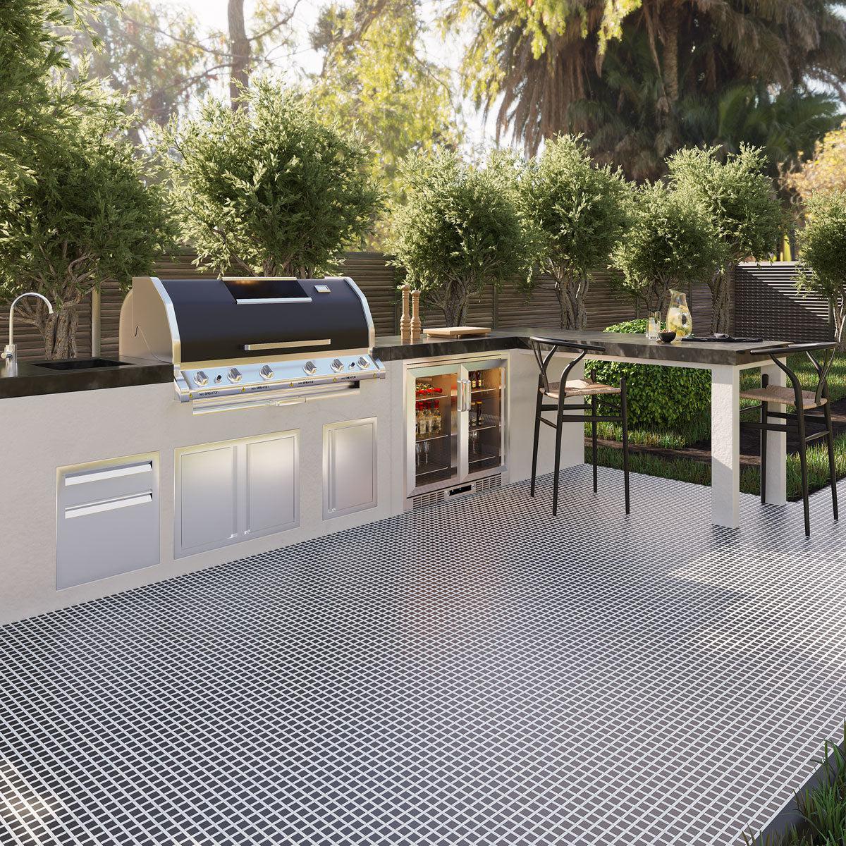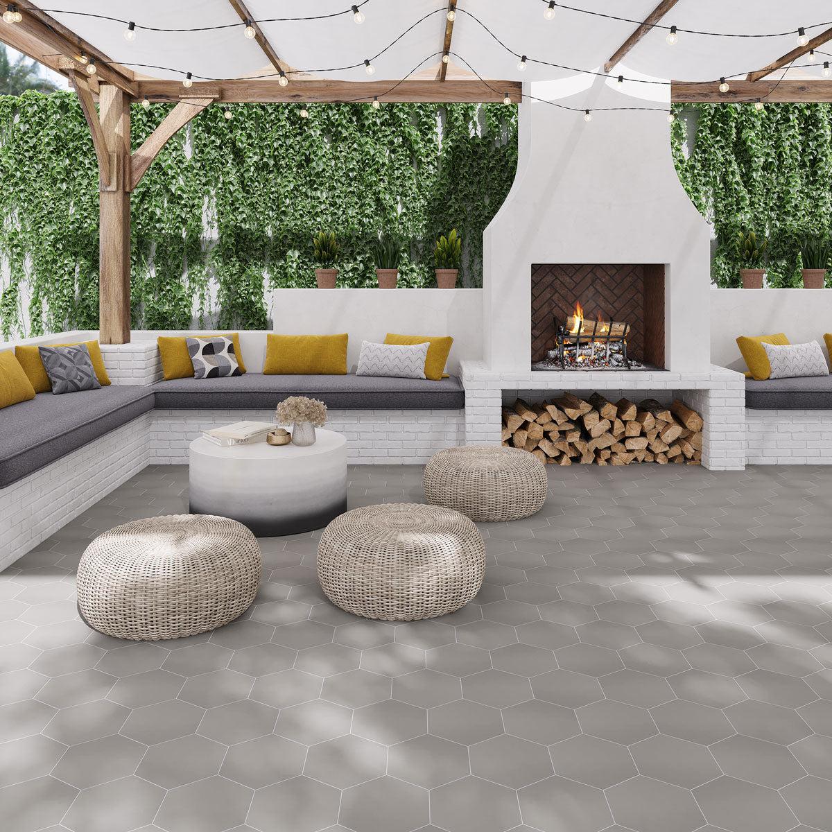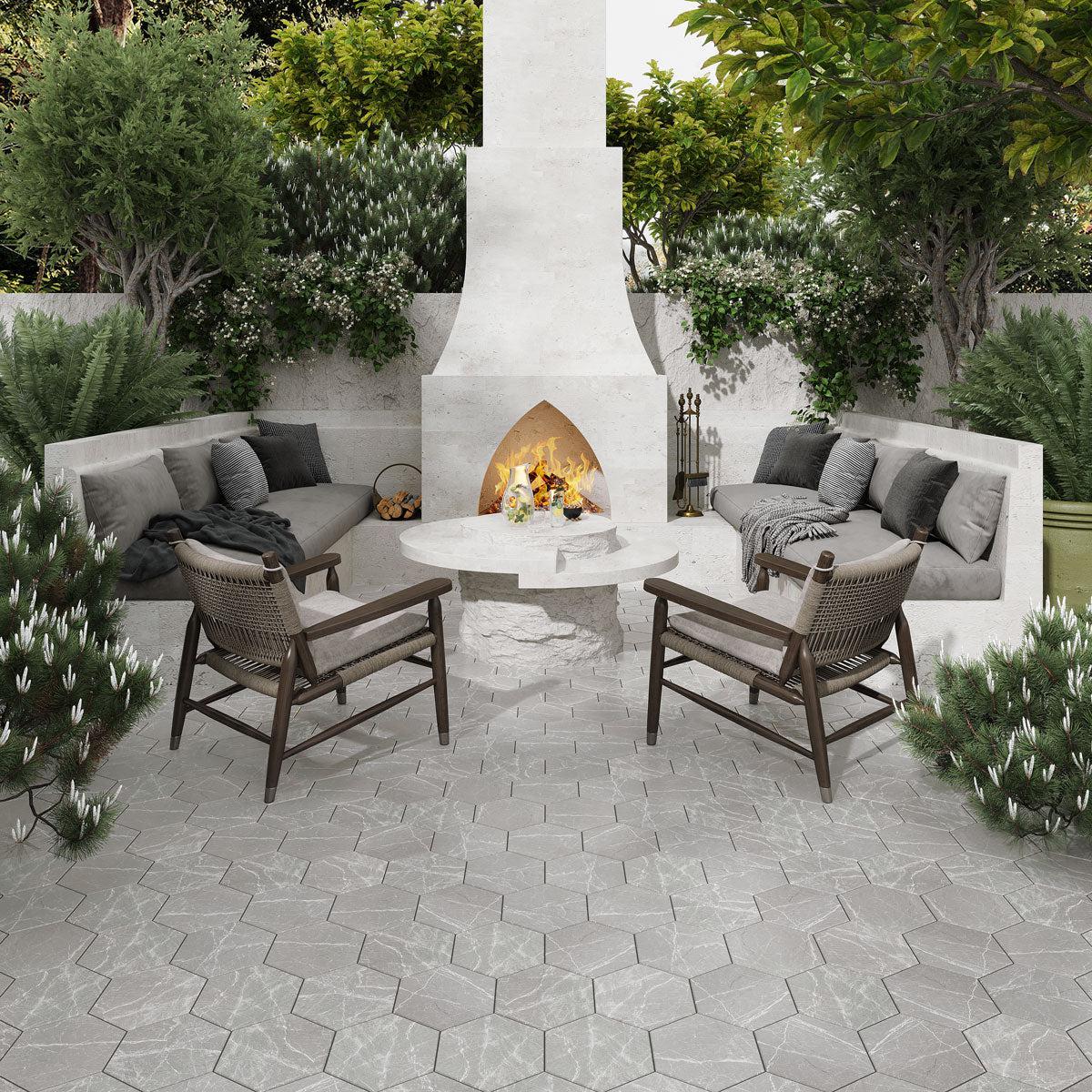 A firepit sitting area can be a great place to add your backyard bar. Accentuate the theme with our neutral but outstanding Cosmo Silver Porcelain Hexagon Tile. The tiles are sturdily made to withstand elements while transforming your space.