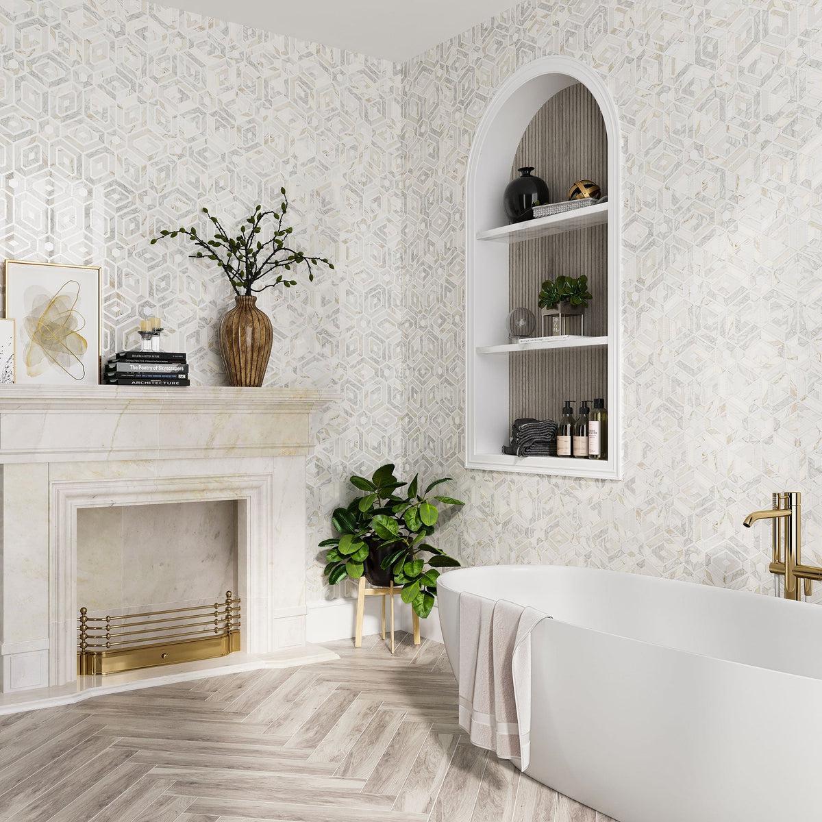 Arches and curves add a sense of drama and movement to a room and can also be used to highlight certain features. When used sparingly, they can add a touch of sophistication to any space. For example, the above bathroom design uses an arch for shower storage with our beautiful Diamond and Hex Calacatta Gold Marble Mosaic tile adorning the walls for a dose of luxurious glam. One of our favorite 2023 home decor trends!