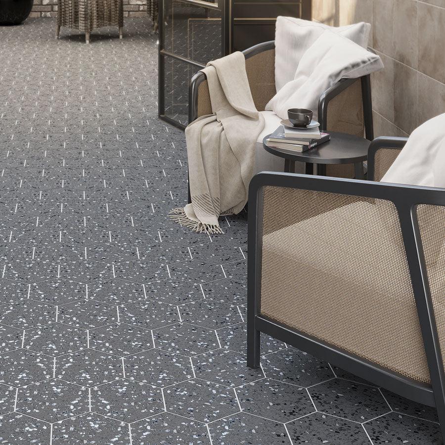 Outlining the Graphite Gray Terrazzo Hex Porcelain Tile with white grout really makes each piece stand out—at the same time amplifying its texture and adding dimension to this restaurant floor and wall!