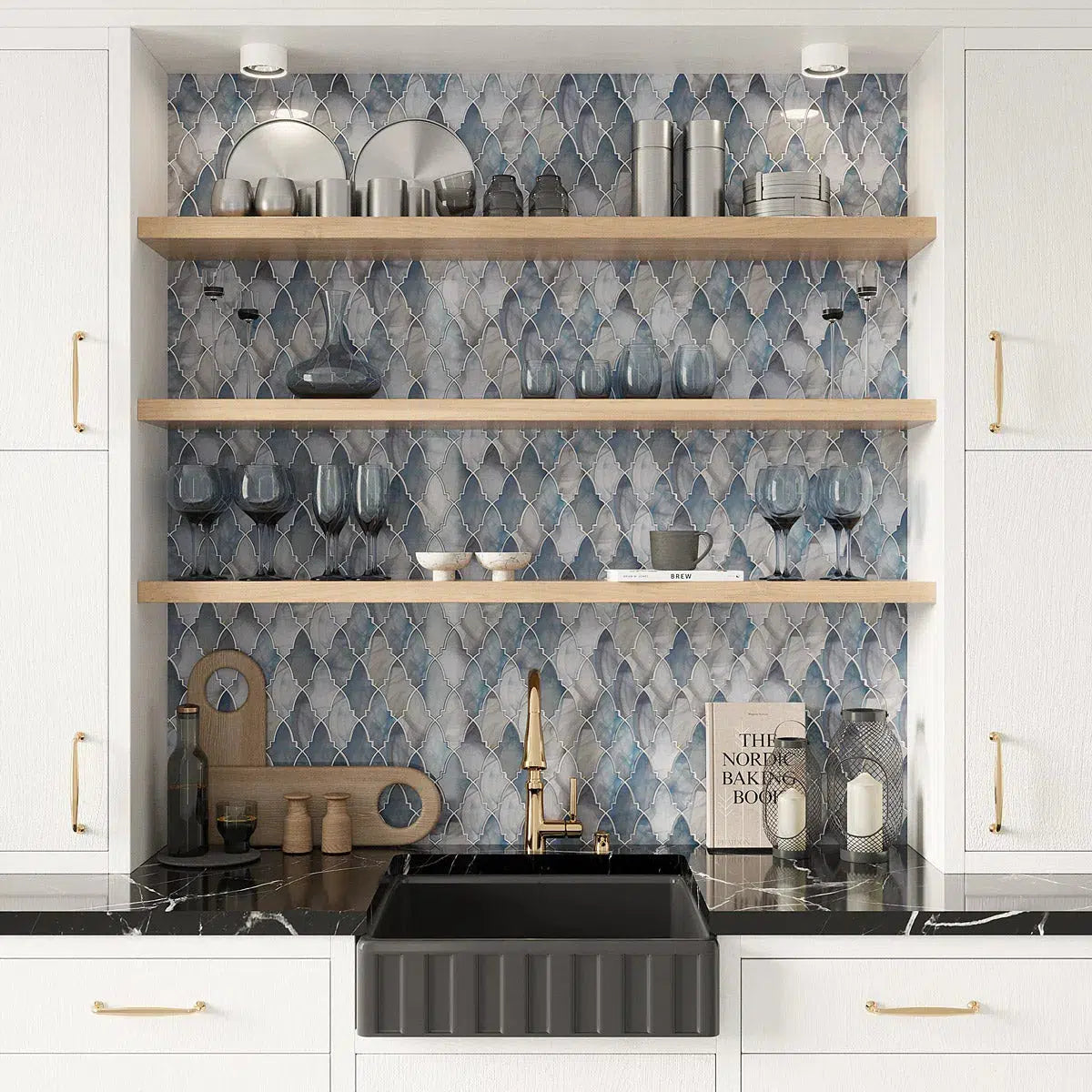 Consider our Sea Glass Louvre Blue Mosaic Tile. Staying true to its fancy name, this exquisite tile has a moody blue shade, complete with an intricate pattern that whispers “deluxe” in the most sophisticated way. Add this beauty to your kitchen, and you’ll be effortlessly riding the wave of quiet luxury, no full-on darkness required.
