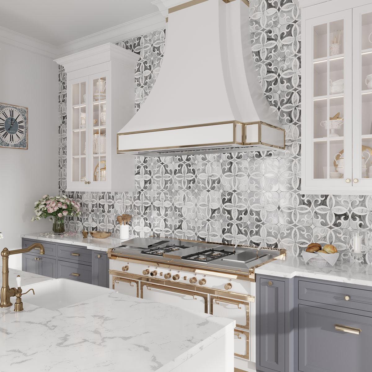 A perfect example is the kitchen pictured above, featuring a marble mosaic backsplash tile that embodies the symmetrical elegance and flowing curves characteristic of the 1800s. It's not just about replicating the past – it's about reinterpreting it with a modern twist, creating a space that feels both familiar and fresh.