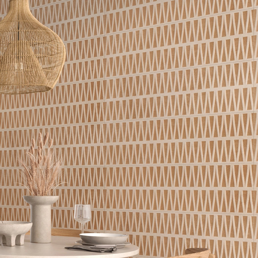 Aside from the floor, terracotta tiles also make fantastic accent features. We’ve already shown you how they can create a statement fireplace in the living room, but now allow us to show you how to bring that same wow-factor to your dining room walls. Case in point: this wall, completely transformed by our Tera Cotta Geometric Ceramic Wall Tile.