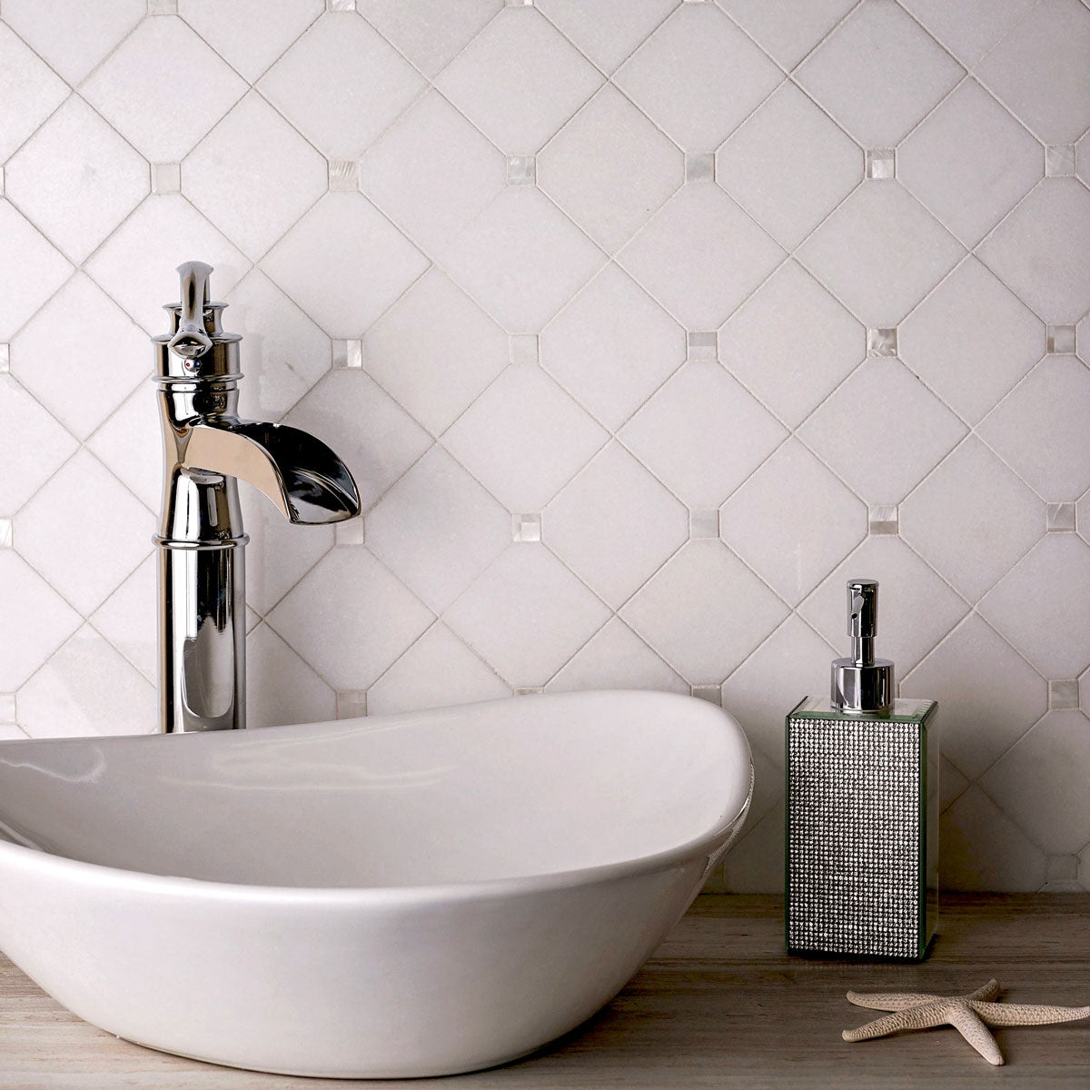 Our neutral Square Rhombus Pearl White Thassos shell tile features shimmering squares of mother of tiles that will add a simple, clean but dramatic effect to your bathroom.