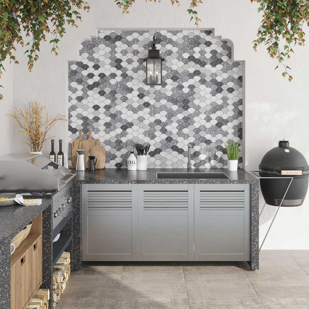 Our black and gray terrazzo tile is a great choice for the outdoor accent wall as the color contrasts well with the greenery around. The pattern has a wave-like shape that is perfect for an outdoor space.