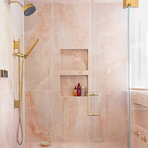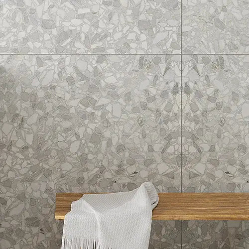 If you desire a user-friendly and efficient space, a mudroom can be the key to an organized home. This mudroom is both functional and aesthetically pleasing, creating a charming and characterful interior! Our Arches Wooden Beige & Bardiglio Marble Tile beautifully complements the wooden storage cabinet and light fixture.