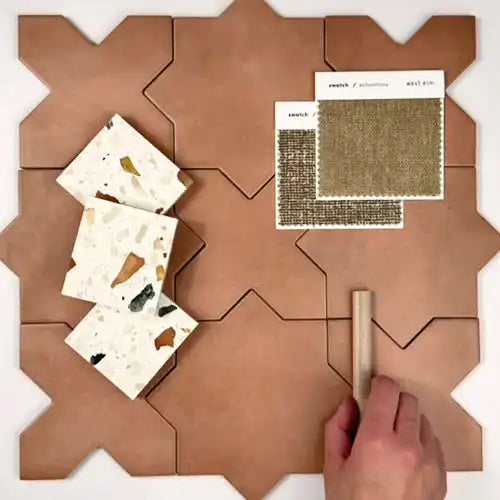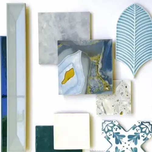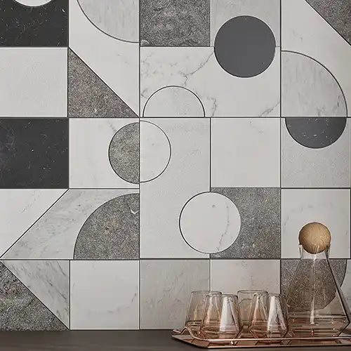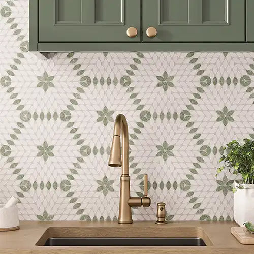Looking for a hardworking and durable floor, our Sand Valley & Thassos Star Mosaic Tile is the perfect pick. Plus the combination of Thassos white hues and beige Crystal Sand shades add a sophisticated touch that can complement white painted cabinets and blue appliances for a beautiful color scheme.