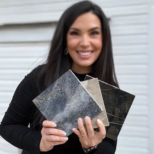 We love peel and stick tiles (adhesive-backed sheets featuring tile-like designs) for a finish that’s both functional and current. Remington Avenue used stunning marble hexagon peel and stick tiles to create her chic blue and white laundry room and prep area. Adhesive tiles are especially great if you aren’t ready to hire a professional tile setter but instead are considering a quick DIY solution.
