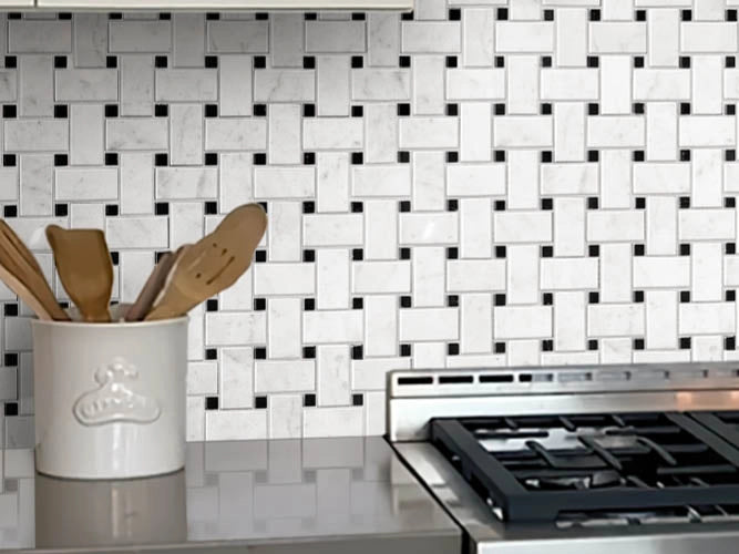 Basketweave tile is one of the most classic ways to introduce a catchy geometric pattern into your home decor! Used on its own or alongside other tile patterns, woven tile designs render a timeless recognizable look that will suit any indoor or outdoor project. This unique pattern originated from straw basket ornamentation that also popular in textiles, furniture, and other elements of home décor. Intricately placed mosaic pieces create the look of interwoven materials. They echo fabric, ribbons, straw, or other designs rendered in our beautiful collection of marble and glass.
