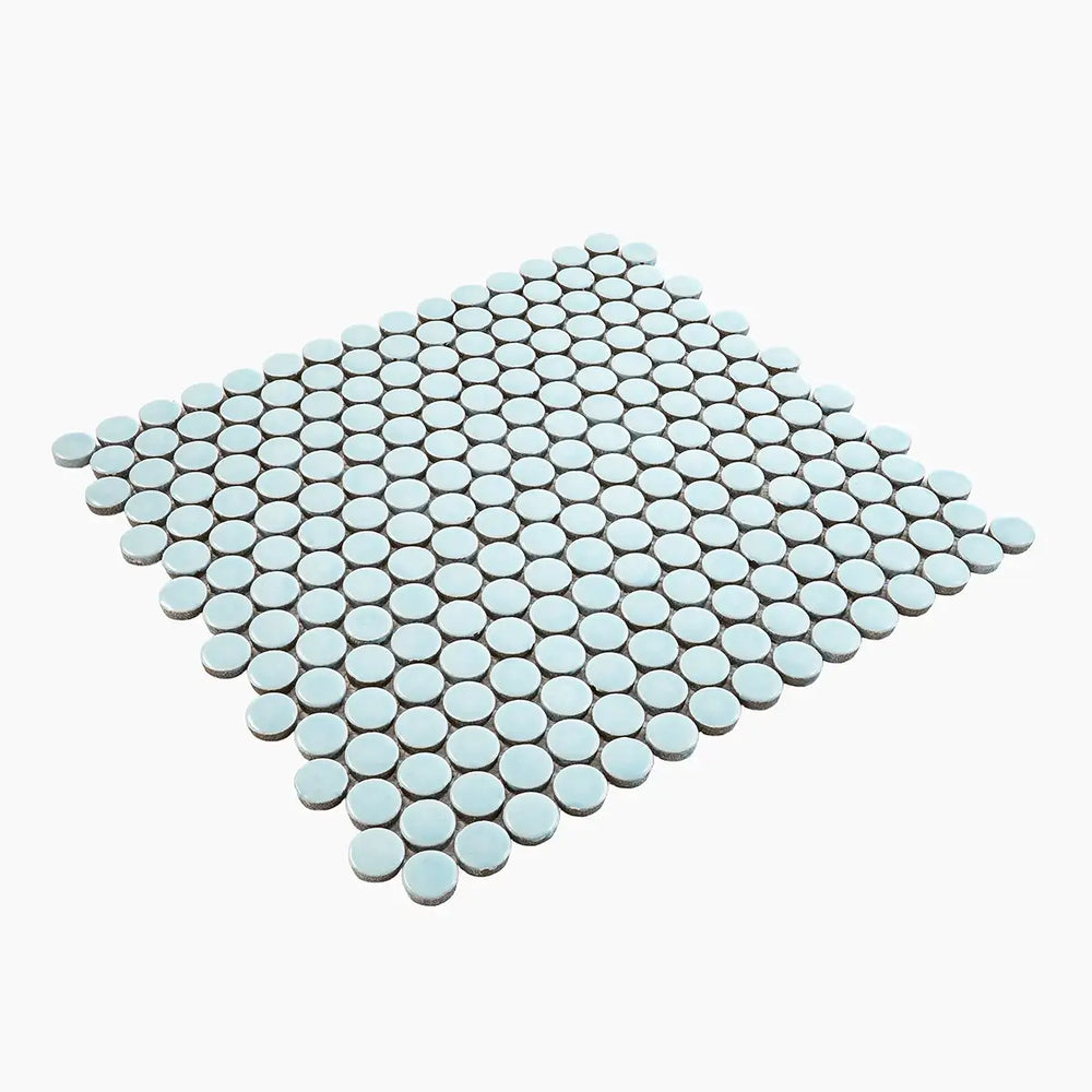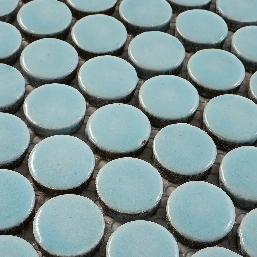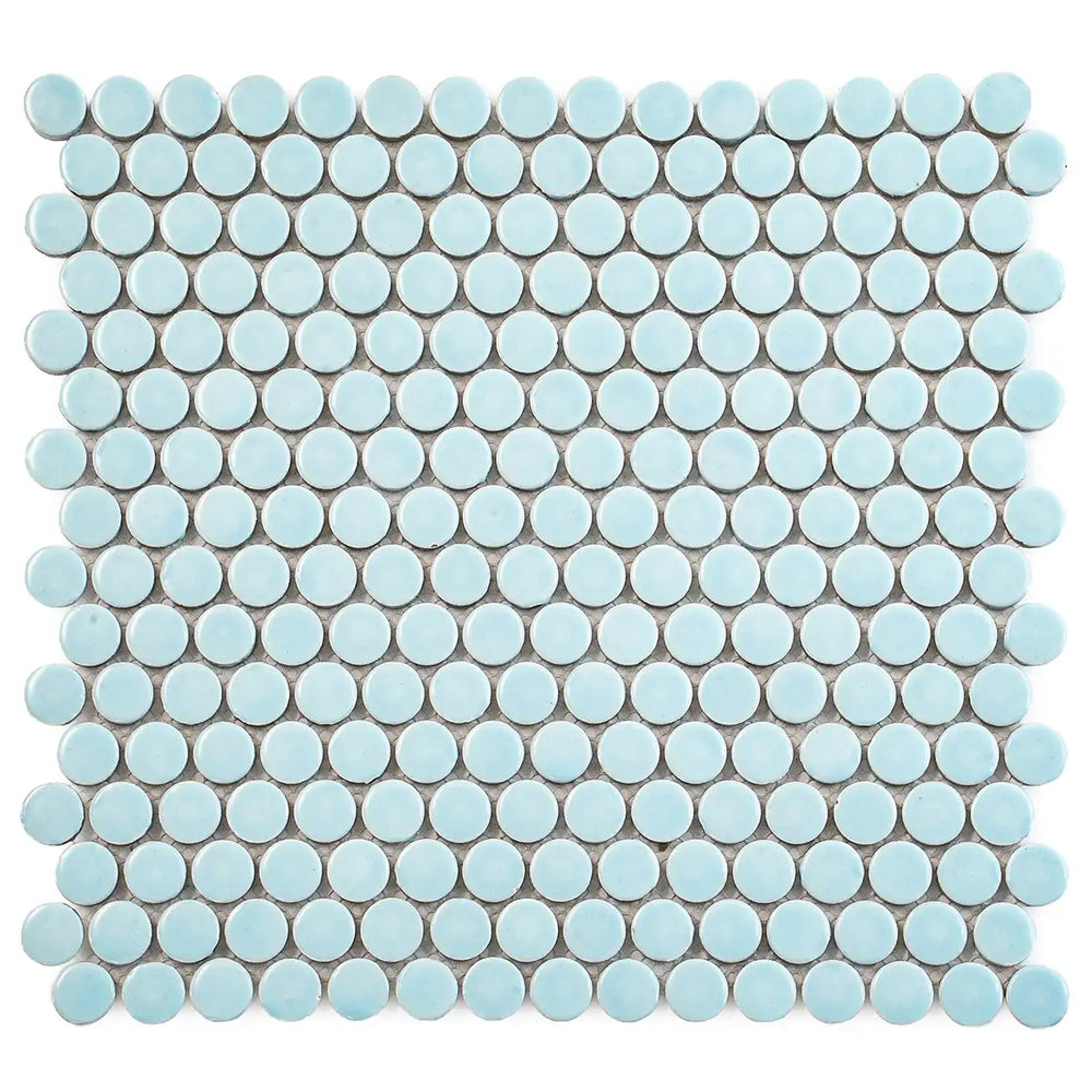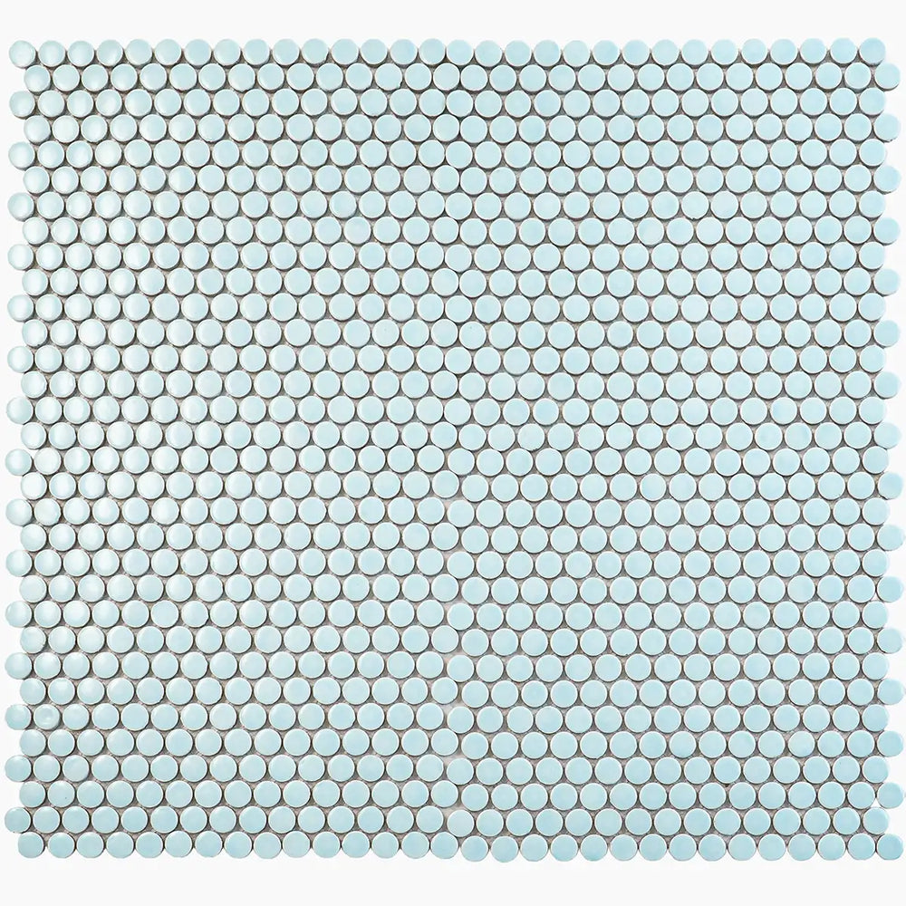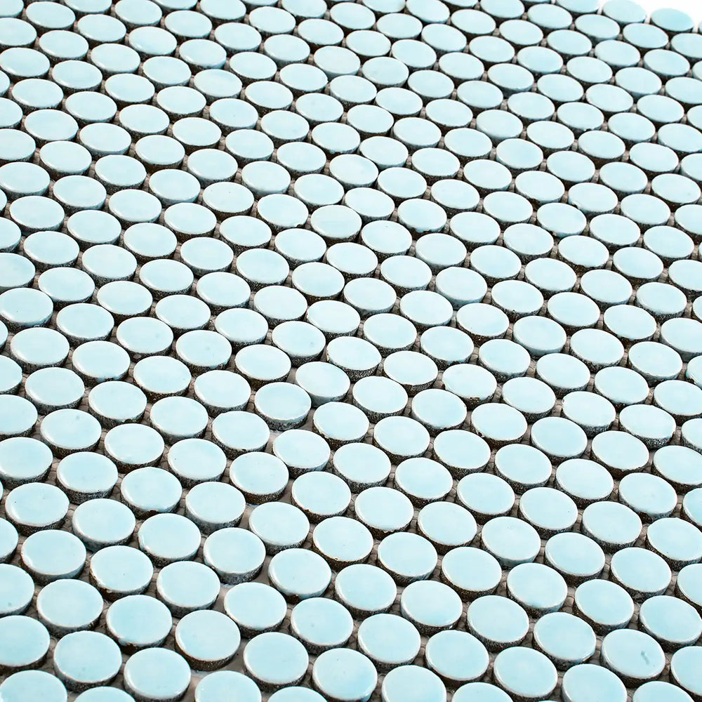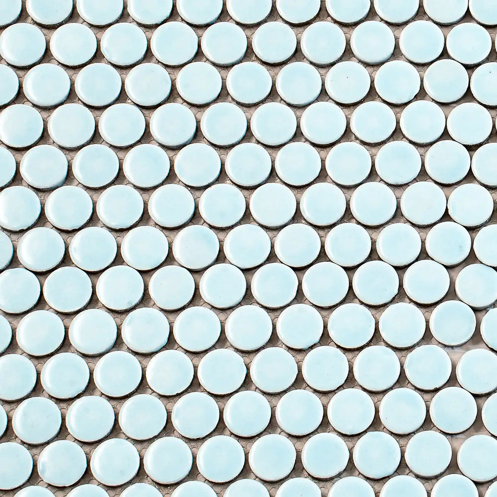 The glossy light blue color adds an eye-catching shine to a nautical bathroom design or a simple blue kitchen backsplash. The glossy finish on these petite porcelain adds an eye-catching shine to a beachy commercial or bathroom floor design. These tiles provide ample grip underfoot, making them a safe choice for your shower floor. They are also a safe choice for your fireplace surround. These porcelain tiles are a great choice for a submerged area, like a fun and retro swimming pool design. Our Light Blue Buttons Porcelain Penny Round Tile is a fun and colorful way to decorate both your interior and exterior spaces.