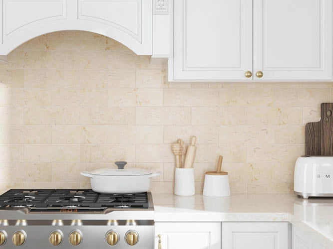 Discover Crema Marfil marble tile in soft beige tones with natural variation, ideal for bathroom walls, shower floors, kitchen designs, and elegant entryway surfaces.