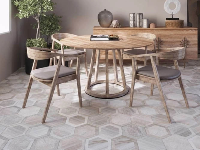 Our best-selling Esagona Hexagon Tiles are made of porcelain but mimic shades of Scandinavian wood! These neutral pieces can be used to add neutral tones to floors and walls.