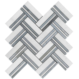 Herringbone pattern is one of the most popular tile designs for modern homes. Catchy and dynamic it sets a striking look for spaces that need an extra punch. Pieces of white Carrara and Eastern Blue marble tile* are paired to achieve a fresh, refined appeal and add a little hint of color. Double strips provide a more detailed look and amplify the visual interest. This natural marble mosaic tile can embellish any space and become a bright but modest focal point for all interior and exterior projects. It is an approved herringbone floor tile for low and high traffic areas and an astonishing solution for various wall applications. Bring an elegant touch to your kitchen with a blue and white herringbone backsplash or revamp your bathroom with catchy herringbone walls. Thanks to multiple grout lines these tiles are much more slip-resistant in moist-areas and safe for shower floors as well.