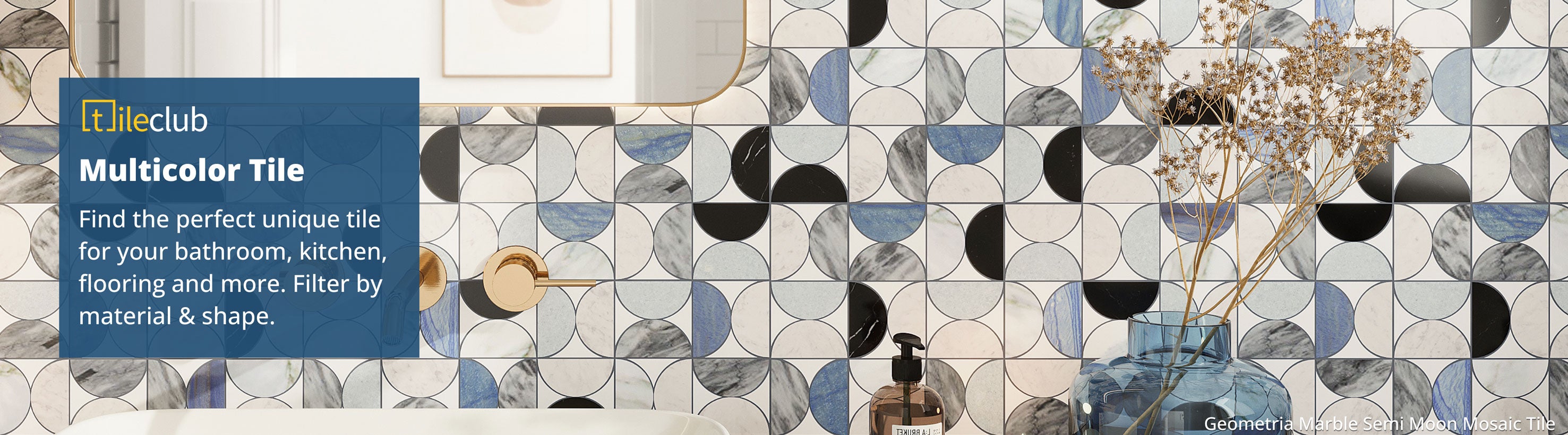 Looking for just the right color for your next project? No need to pick just one with our selection of multicolor tile! Choose from our selection of multicolor tiles in glass, mosaic, and marble to add a creative and colorful mosaic accent to any room! Pair classic blue and white, different earth tones with a selection of different natural stone and marble mosaic tiles, recycled glass tiles in a variety of colors to create a beautiful tiled kitchen, bathroom, or shower wall.