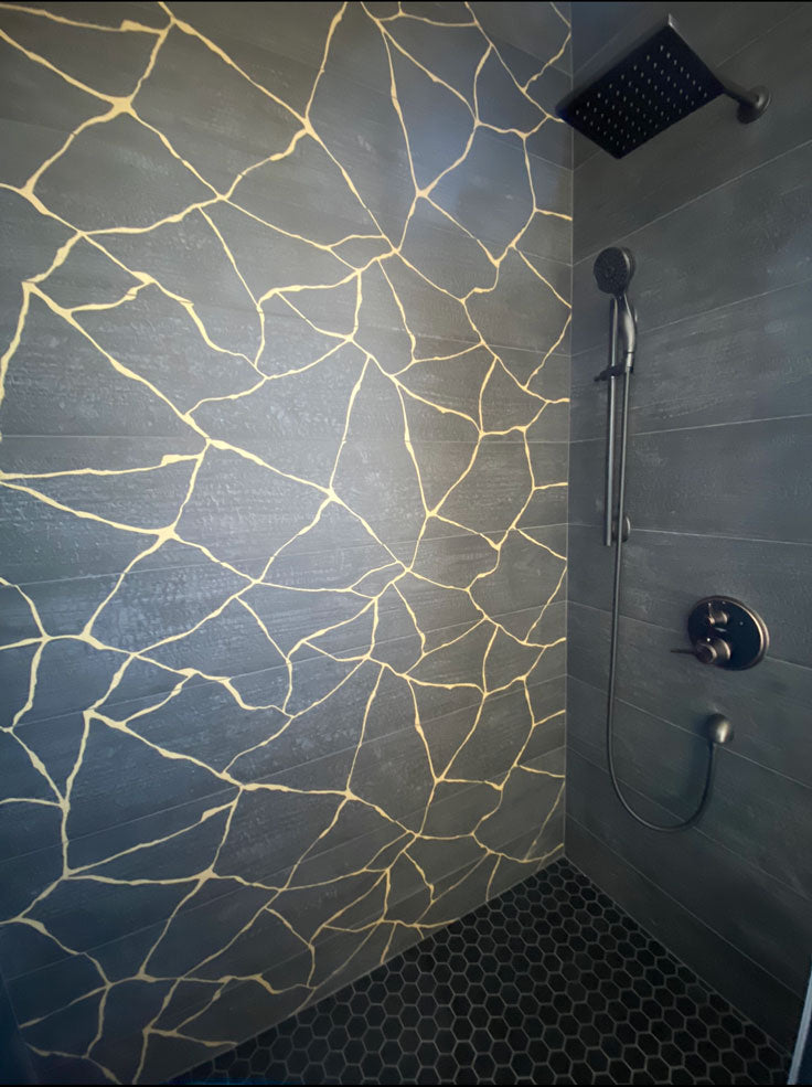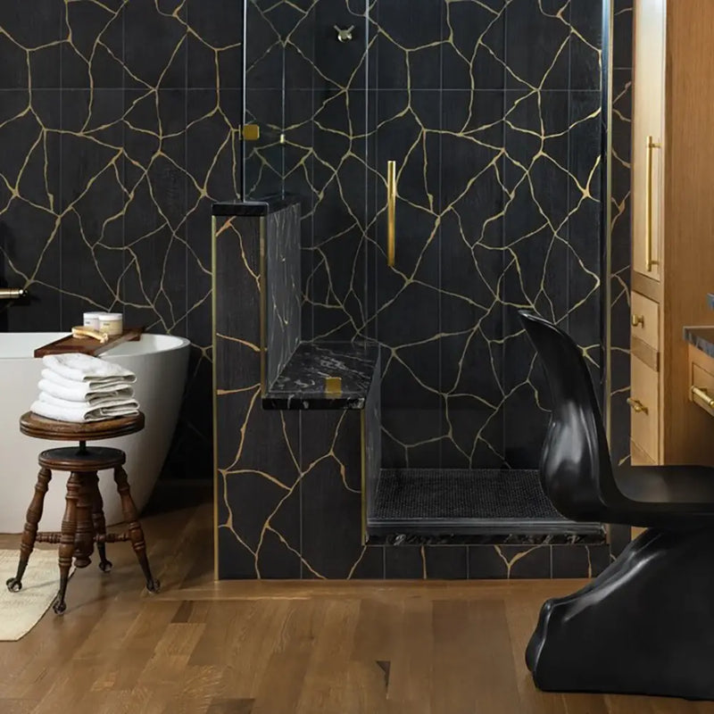 *Each box of the Kasai Notte Kintsu tile contains 3 pieces, each measuring 9.8" x 59" to cover 12.105 square feet. The pattern on each tile will vary and can be laid in your preferred arrangement to create a continuous pattern or other design. Can also be paired with the plain black wood-look Kasai Notte tile, or Kasai Notte Sakura flower patterned porcelain tile.