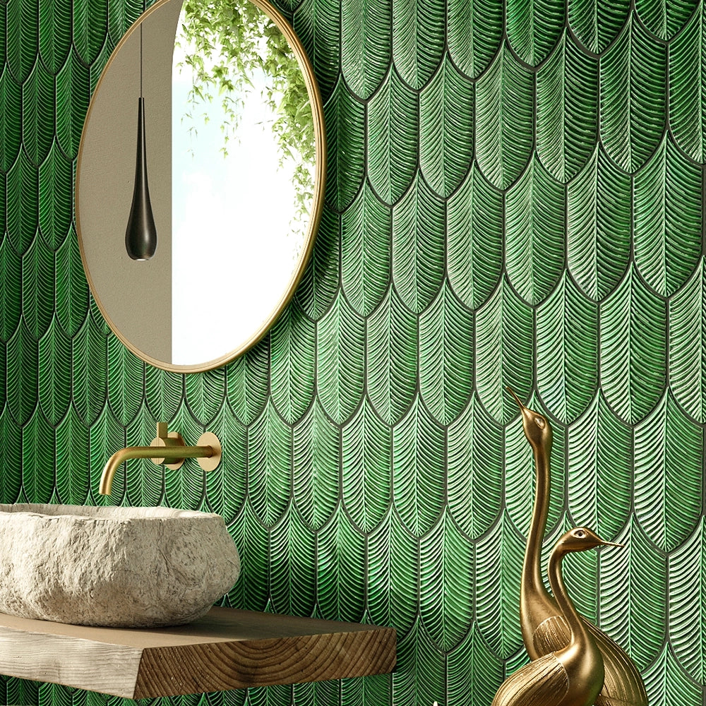 Enhance your living area with these stunning and creative ideas to design with tiles! Add a rustic touch with wood look porcelain floor tiles, create a glamorous fireplace tile surround with Mother of Pearl, or a modern accent wall with dramatic field tiles!