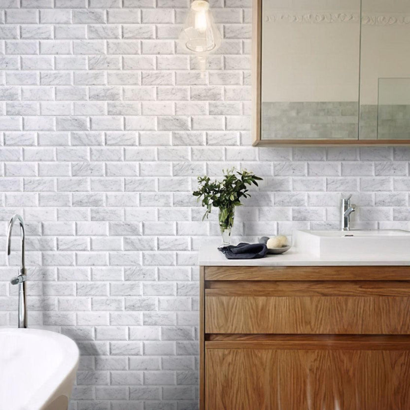 Our Bianco Carrara beveled marble tile is a marvelous modern rendition of classic marble décor. These marble subway tiles have the glorious imperfections of authentic Bianco Carrara that is a pale white marble variety with smoky or dull gray organic veining. While less white than other types of Carrara marble, Bianco Carrara is often preferred because it has more dimension and greater visual appeal as it does not have a stark white look that can dull other elements in a room. Its irregular and inconsistent veining is part of its incomparable beauty and the beveled exterior of these marble tiles brings forth a more pronounced fashion. At times pearlescent and other times a hazy gray, this marble tile is an immaculate choice for both interiors and exteriors although they are not intended for flooring purposes due to their cut. Use them for any wall you wish and watch the room come alive