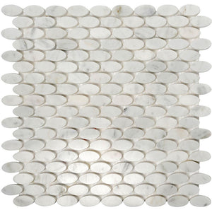 Attractive and fun oval shaped mosaic tiles made up of Bianco Carrara marble adds a unique flair to any design where it's applied. These marble tiles give your room a bold, graphic impact and provide endless design possibilities form contemporary to classic. They are suitable as both floor tile and wall tile in residential and commercial settings. Small shaped mosaic tiles are not only attractive for their visual appeal but they also provide slip resistance!