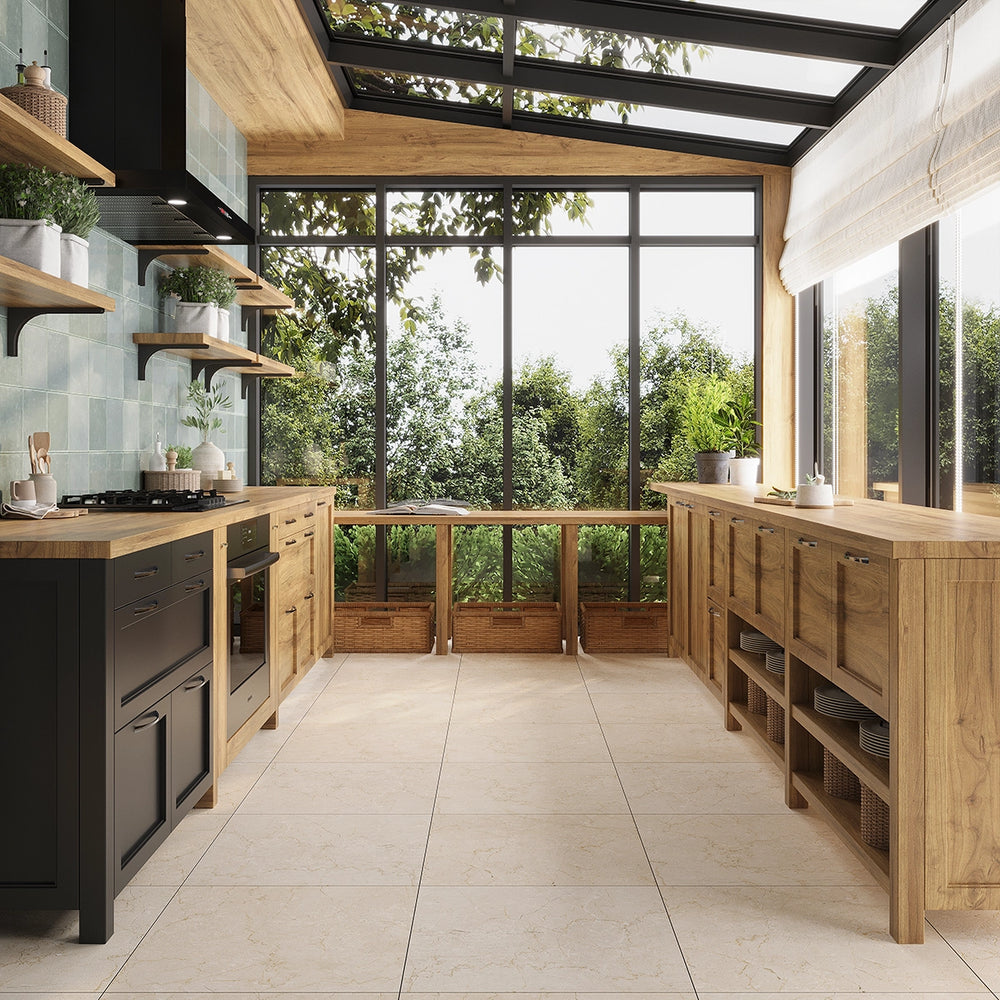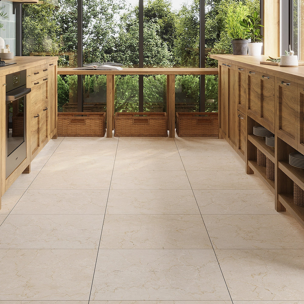 Inspired by warm, sandy Crema Marfil marble, this elegant neutral porcelain tile can be used on its own for a cozy floor or wall treatment, or paired with other Boldara square tiles for a checker pattern.
