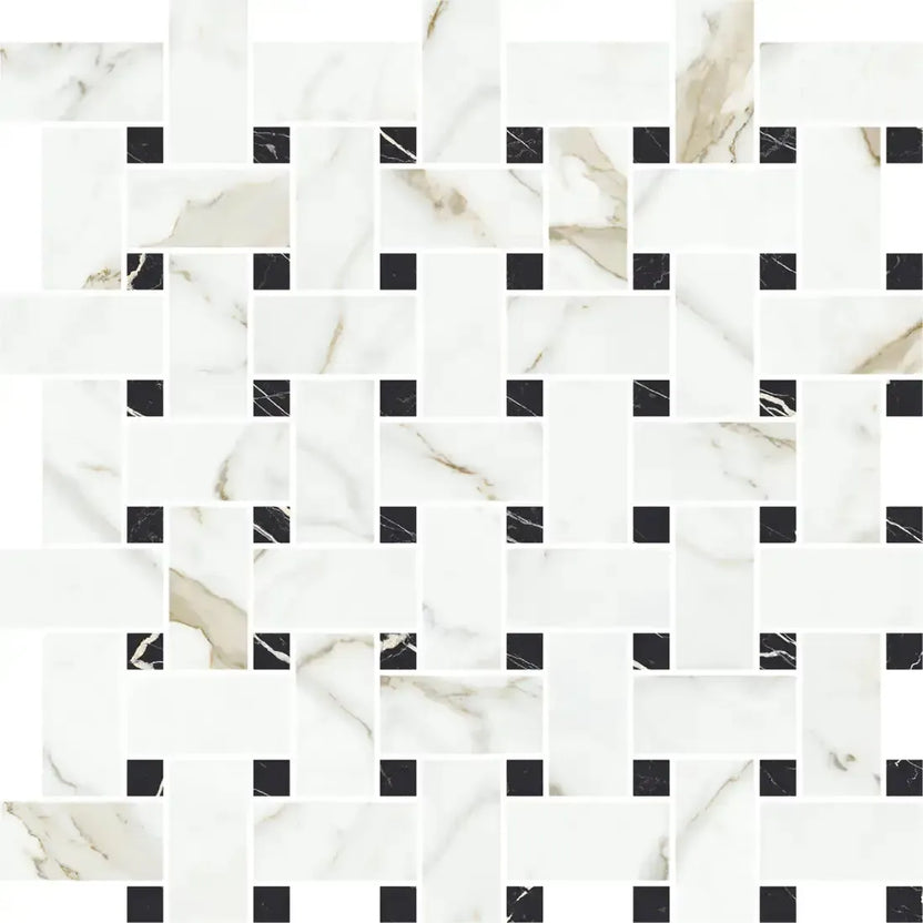 Boldara Oro Basket Weave Porcelain Mosaic Tile Sample ships for free from Tile Club! Order your mosaic tile sample to preview the material, color, and design in person. Tile samples are typically 4” x 5” pieces cut from a full-size tile sheet and are not intended to be installed.