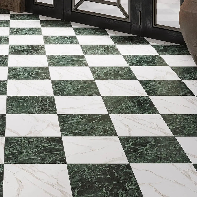 Inspired by natural green marble, our Boldara Verde can stand alone or pair beautifully with other stone-look tiles in the collection! Each square tile has a slightly different pattern to mimic natural stone in a porcelain medium. Create a checkerboard layout by pairing with Boldara Oro, Blue, or Bianco to bring in the contrast of other colors.