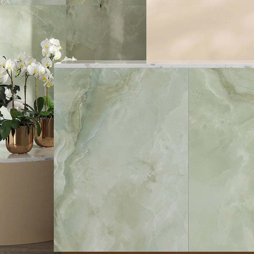 Emporio Jade Crystal-Look Porcelain Tile Crosscut 24x48 is a gorgeous new addition to Tile Club's best selling Emporio Stone-Look Large Format tiles. This tile uses innovative digital scanning and surfacing techniques to create a 3D honed finish that offers the elegance of nature's most precious stones with the durability of porcelain. Inspired by the delicacy of precious Onyx stones, our Emporio Crystal collection is an exquisite combination of natural and technological artistry. These large-format porcelain tiles are sold in boxes of 2 pieces each, with a total of sixteen porcelain faces available. Adorn floors or walls with these spectacular designs, which can be used to add luxurious style to homes and businesses.