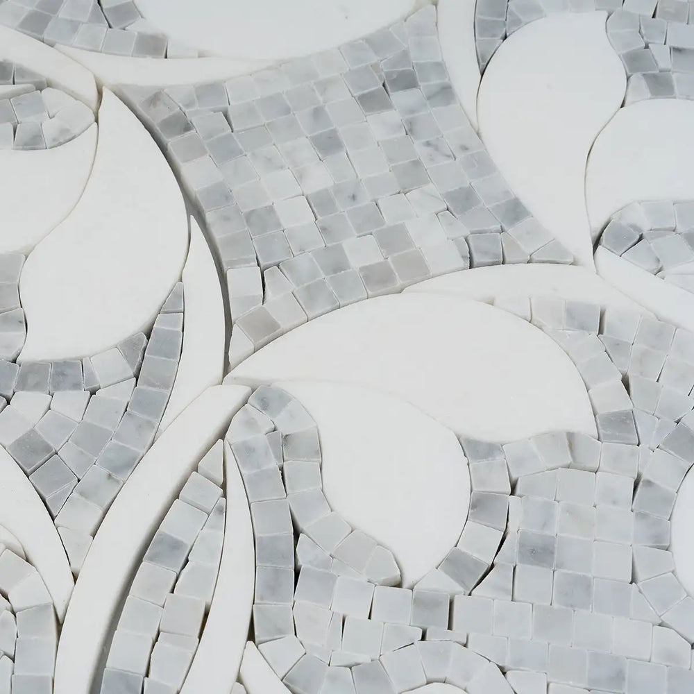 Add an exquisite elegant touch to your home design by using our Floral Dream Bianco Carrara & Thassos Mosaic for indoor or outdoor spaces! Small gray marble tile chips create a captivating flower pattern to bring a fresh, romantic flair to your space. Grey mosaic hues allow you to use this polished mosaic tile with any color scheme you like. This marble tile is a true piece of art that can decorate your bathroom or kitchen backsplash, shower, living room, deck, patio, and other indoor and outdoor environments. Due to such features of marble as slip and heat resistance, you can apply this product to shower walls and floors, steam rooms, and saunas. It is a sturdy floor tile for both light and heavy traffic. Whether you would like to cover the entire area or create a popping accent piece, your dreams will come true with our Floral Dream marble tile!