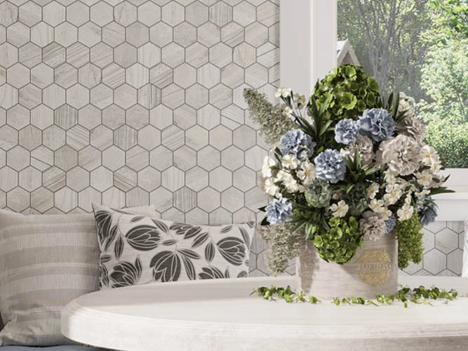 The natural look of our Gems Hex Blanco porcelain tile was inspired by traditional whitewashed wood designs. Subdued gray and beige hues create a refreshing, light look, that perfectly matches any color palette. A timeless porcelain hexagon tiles pattern can enhance any interior and exterior design and bring a lively feel. Different grout colors will let you play with a look, making it more neutral or modern. Porcelain tiles are easy to maintain, durable, resistant to moisture, hot, and cold temperatures, which makes them so versatile and suitable for multiple applications. Bring a natural touch to your kitchen, hallway, bathroom, hallway, or patio. Whether you cover entire walls or floors, or just add an accent piece, this product will be a true Gem! Use it for a high-quality porcelain flooring in any area you like, including exterior floor applications. Use it for a captivating wood porcelain tile backsplash, fireplace décor, statement wall, niche, or any other accent you desire.