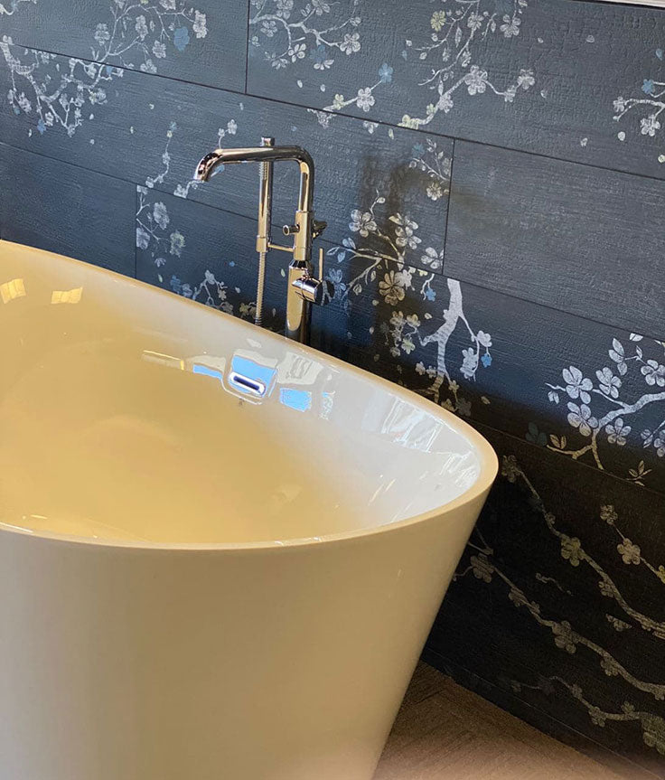 Your living room, dining room, or bedroom is the perfect place to unleash your creative genius by crafting a masterfully designed accent wall without overpowering the space. Add a distinctive touch to fireplace surrounds, cocktail stations, and alcoves. The tiles' dark body and floral design infuse a pop of color to an otherwise neutral room — or pair it with soft pastels for an instantly whimsical finish — as well as moody hues such as dusty pink, moody blue, or plum for a welcoming atmosphere.
