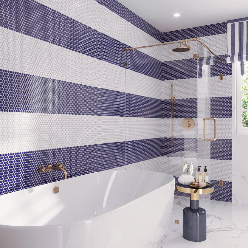 Looking for a fresh take on penny round tiles? Our Navy Blue Buttons Porcelain Penny Round Tile is a fun and colorful way to decorate both indoors and outdoors. The glossy finish on these petite porcelain adds an eye-catching shine to a nautical bathroom design or a bold blue kitchen backsplash. Despite the smooth surface, these tiles provide ample grip underfoot, making them a safe choice for your shower floor. Don’t let their small size fool you! Navy Blue Buttons Penny Rounds are made of durable twice-fired porcelain so they are strong enough for even high-traffic floors in a restaurant bathroom or mudroom entryway. They are also a great choice for a submerged area, like a fun and retro swimming pool design.