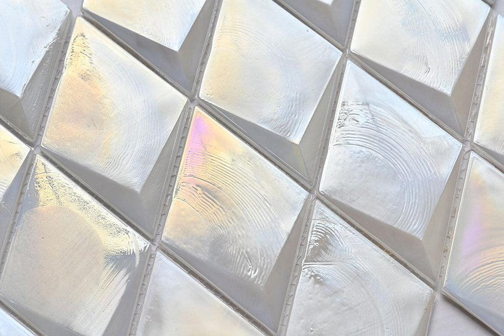 Experience the radiant dance of geometric design and modern surface details with this glass mosaic tile. Our pearl white diamond tile will illuminate your space with an innovative 3D surface that breaks the boundaries of conventional decor. This 3D tile transforms residential or commercial spaces with a fresh perspective on the timeless diamond pattern. Watch in awe as these glistening diamond tiles reflect light and illuminate your interiors with a captivating brilliance!