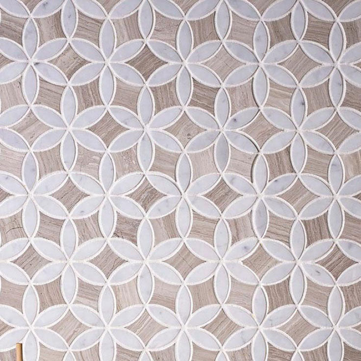 Roman Flower Wooden Beige and Carrara Marble Mosaic Tile is one of our most popular marble mosaic tiles thanks to the stunning neutral palette and exquisite craftsmanship! The combination of Wooden Grey and Bianco Carrara marble is a lovely addition to any interior style, whether it's a contemporary bathroom with organic decor or a rustic modern farmhouse kitchen backsplash! The intricate floral mosaic tile is backed by mesh sheets measuring 11.7" x 15.2" and provides an interlocking pattern for quick and easy installation of this beautiful detail!