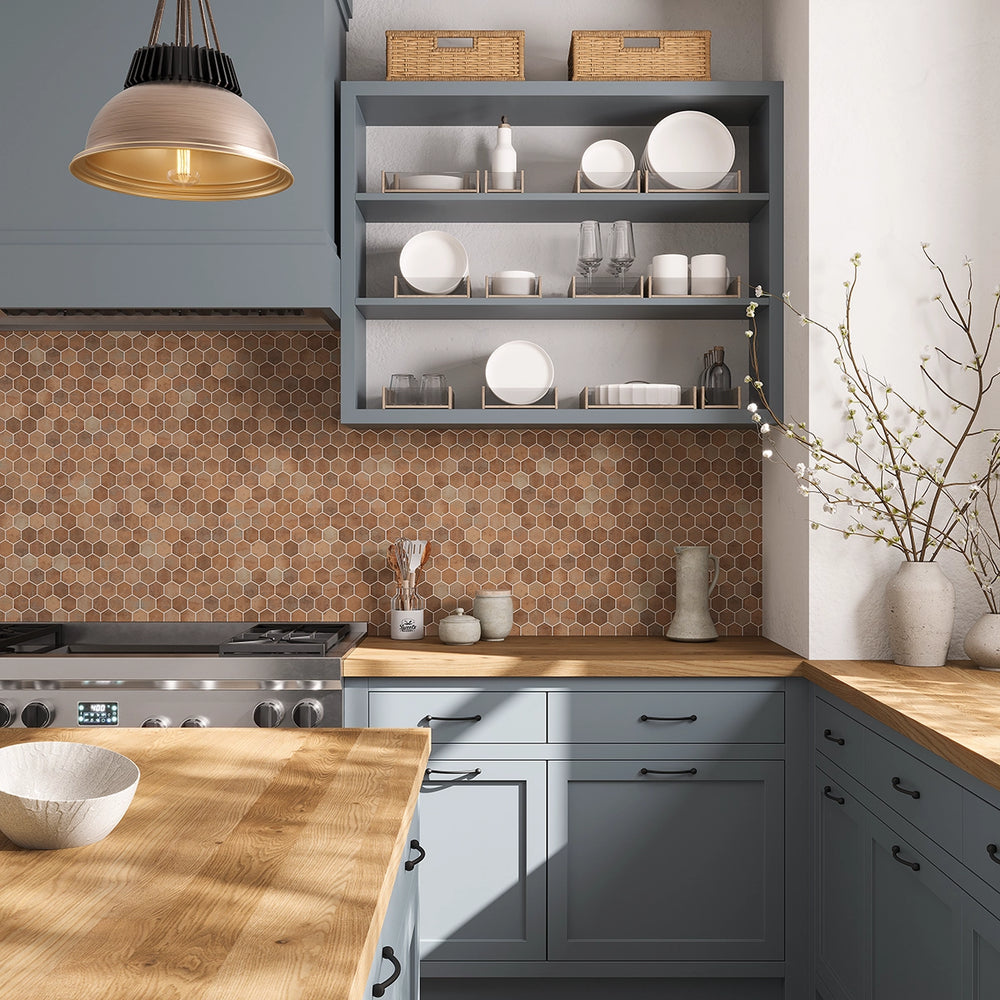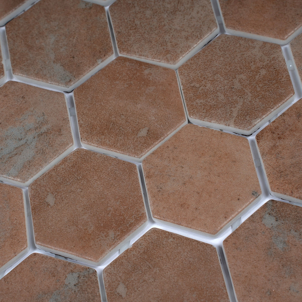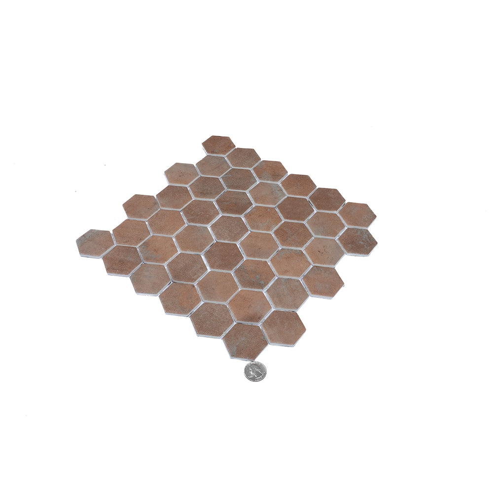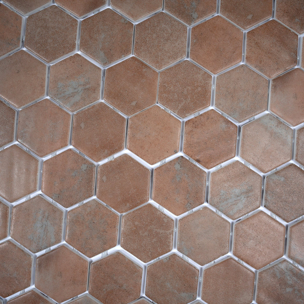 Sagrada Recycled Glass Copper Hexagon Mosaic Tile is a new eco-friendly building material! This gorgeous mosaic is made of repurposed glass, combining style with sustainability. This matte dot mounted hexagon mosaic tile can be installed throughout your home, including low-maintenance backsplash designs and slip-resistant flooring. The dark earthy tone features subtle color variation to amplify the organic look. You can use our Sagrada recycled glass tiles both indoors and outdoors, including in submerged areas like shower floors and stylish swimming pools. It's a great choice for an environmentally friendly commercial wall as well!
